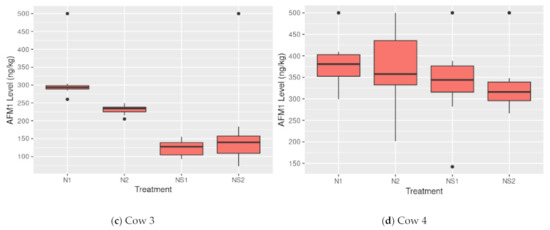 (a–d) Pattern of AFM1 concentration in milk from individual cows (1–4), where treatment is: NS1- Binder included in feed at 0.6%, NS2-Binder-included in feed at 1.2%, and N1 and N2—Feed without binder.