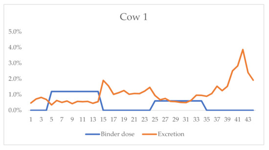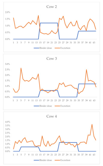 Shows secretion rate of AFM1 in milk against the binder dose from the four experimental units (Cow 1–4).