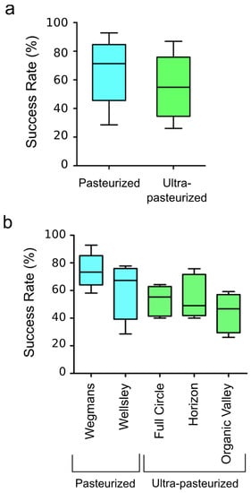 Results of the success rates by pasteurization type are presented in Figure 1a and Table 1. While the mean success rate was significant for pasteurized milk (mean success rate = 0.6764, p < 0.01), it was not significant for ultrapasteurized milk (mean success rate = 0.5060, p = 0.8170). The data were further analyzed to determine if there were differences in success rates by brand (Figure 1b and Table 2).