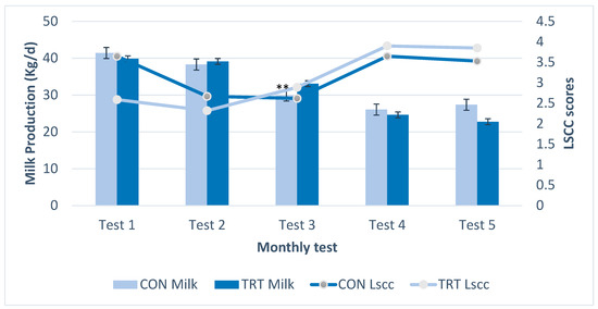 Distribution of milk production and linear somatic cell score (LSCC) across the monthly milk test days among cows in treatment (TRT; no headlocks) and control (CON; regular headlock) groups. ** denotes a statistically significant difference.