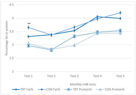 Milk fat% (mean ± SE) was significantly greater in the TRT than in the CON group on the first monthly milk test (3.31 ± 0.12 vs. 3.65 ± 0.06, p = 0.01) (Figure 2). Milk protein% was very significantly greater only on the third test (3.32 ± 0.05 vs. 2.98 ± 0.05, p < 0.001). There was no significant association between milk protein% and lock-up time. Similarly, there was no significant difference between the TRT and CON groups when evaluating the LSCC.