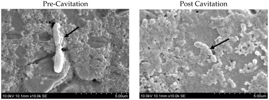 Scanning electron microscopic images of Bacillus sporothermodurans (ATCC10599) vegetative cells before and after cavitation. The arrows in the figures indicate the morphology of the vegetative cells pre and post cavitation.