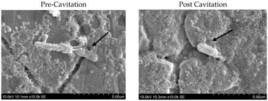 Scanning electron microscopic images of Geobacillus stearothermophilus (ATCC®15952). Vegetative cells before and after cavitation. The arrows in the figures indicate the morphology of the vegetative cells pre and post cavitation.