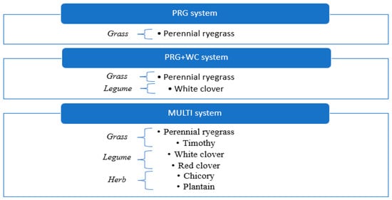 The present study investigated and compared the FA, carotenoid and fat-soluble vitamin composition of multispecies (MULTI) (consisting of perennial ryegrass (Lolium perenne), timothy (Phleum pratense), white clover (Trifolium repens), red clover (Trifolium pratense), chicory (Chicorium intybus) and plantain (Plantago lanceolata)) with two other conventional grazing systems (i.e., monoculture perennial ryegrass (PRG) and a binary mixture of perennial ryegrass and white clover (PRG+WC)) over the Irish late-summer grazing season (July–September). FAs were profiled using gas chromatography–triple-quadruple–mass spectrometry (GC–QqQ–MS), and carotenoids and vitamins were assessed using liquid chromatography–electrospray ionisation–triple-quadruple–mass spectrometry (LC–ESI–QqQ–MS) in the multiple reaction monitoring (MRM) mode.
