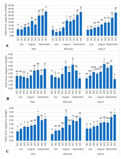 Variations in the α-linolenic acid (A), linoleic acid (B) and palmitic acid (C) levels of the PRG (perennial ryegrass), PRG+WC (perennial ryegrass and white clover) and MULTI (perennial ryegrass, white clover, timothy, red clover, chicory, and plantain) systems estimated weekly (W1, W2, and W3) throughout the summer months (July, August, and September). Different superscript letters indicate significant difference (p < 0.05) within each system.