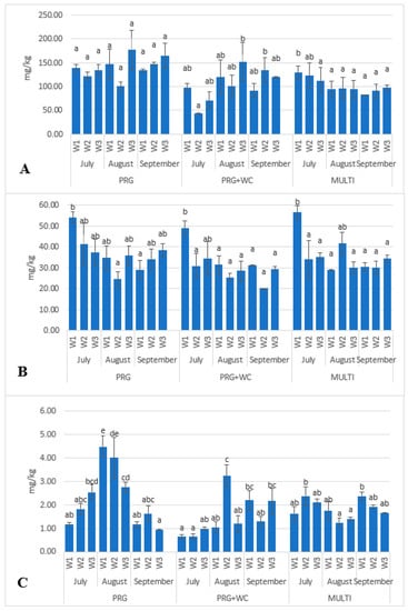 Variations in the β-carotene (A), lutein (B) and α-tocopherol (C) levels of the PRG (perennial ryegrass), PRG+WC (perennial ryegrass and white clover) and MULTI (perennial ryegrass, white clover, timothy, red clover, chicory, and plantain) systems estimated weekly (W1, W2, and W3) throughout the summer months (July, August, and September). Different superscript letters indicate significant difference (p < 0.05) within each system.