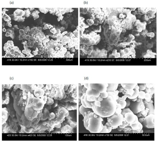 The samples were prepared and observed per standard procedures []. A double-sided carbon (sticky small circular) tape was attached to the SEM aluminum stub. The powder was spread on the tape. To improve the clarity of images and reduce the charging effect, gold (Au) (Kurt J Lesker Company, Jefferson Hills, PA, USA) was coated (10 nm thickness) as sputtering material in the sputtering machine (CRC-150 sputtering System, Plasma Science Inc., Marlboro, NY, USA). The samples were examined using SEM (Scanning Electron Microscope, S-3400N, Hitachi Sci. Systems Ltd., Ibaraki, Japan) at 200, 100, 50, and 30 μm levels.