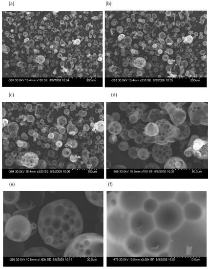 The most commonly used technique for dried milk powders to study the microstructure is scanning electron microscopy (SEM) [,,,]. Other techniques, such as transmission electron and atomic force microscopy, have been used. However, the techniques depend on the goals to be reached [] and what needs to be viewed. SEM works on the principle of an electron beam interacting with a sample specimen and generating signals, which can be used to generate the image []. The three-dimensional structure exhibited by SEM helps characterize ingredients’ physical and textural properties []. In addition, sputter coating with gold/palladium increases the clarity and sharpness of the microscopic images as it reduces the charging effect.