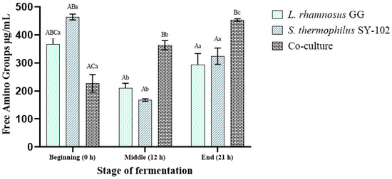 Production of amino groups released during the fermentation of whey with L. rhamnosus GG, S. thermophilus SY-102, and both microorganisms in co-culture. The results are the average of three determinations ± the standard deviation. (a–c) Lowercase letters indicate a comparison of means between times of the same fermentation system. (A–C) Uppercase letters indicate the comparison of means between fermentation systems with the same fermentation time. Samples with the same letter did not present a significant difference using Tukey‘s test (p < 0.05).