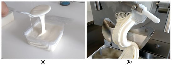 Figure 3. Functional product after fermentation (a) and ice cream during extrusion from the machine at the end of the freezing process (b).
