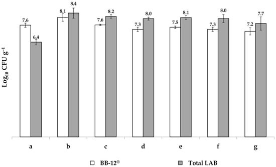 Figure 4. Viable counts (log10 CFU g−1) of Bifidobacterium animalis subsp. lactis (BB-12®) and total lactic acid bacteria (LAB) in inoculated enriched milk (EM) (a), fermented functional product (FFP) after 24 h from production (b), and sheep’s milk ice cream after 1 (c), 30 (d), 60 (e), 90 (f), and 120 (g) days of frozen storage (−20 ± 2 °C). Error bars indicate standard deviations. Different letters within the histograms indicate significant differences between sampling points (p < 0.05).