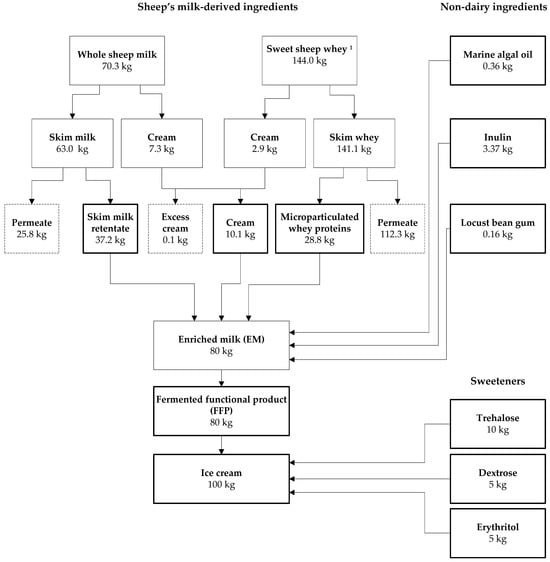 Figure 5. Mass balance for the production of 100 kg of ice cream. 1 Amount of sweet sheep whey obtained from the cheesemaking process of about 250 kg of whole sheep milk.