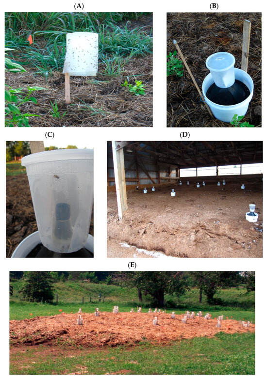 Each emergence trap was a 7.57 L plastic bucket (Leaktite, Leominster, MA, USA) with the bottom removed. A screen-sided 1.89 L funnel (Midwest Can, Melrose Park, IL, USA) was inserted midway into the plastic bucket and capped with a 0.95 L plastic deli container (Delitainer, Lake Forest, IL, USA) to collect the trapped flies (Figure 2C). A plastic 37 mL portion cup (Solo, Lake Forest, IL, USA) with its bottom removed was glued inside a hole on the bottom of each deli container to help to secure the container to the funnel and to facilitate quick removal and replacement. Each container included a laminated note card coated in a 50% Stikem Special, spread to aid the trapping of the flies. Wooden stakes anchored the bucket traps to the straw piles in the case of high winds (Figure 2E). Traps in the compost barns were sheltered by walls; as such, wooden stakes were not needed (Figure 2D). Total possible trap locations within each pile were used to extrapolate the cumulative fly emergence from the entire pile each summer.