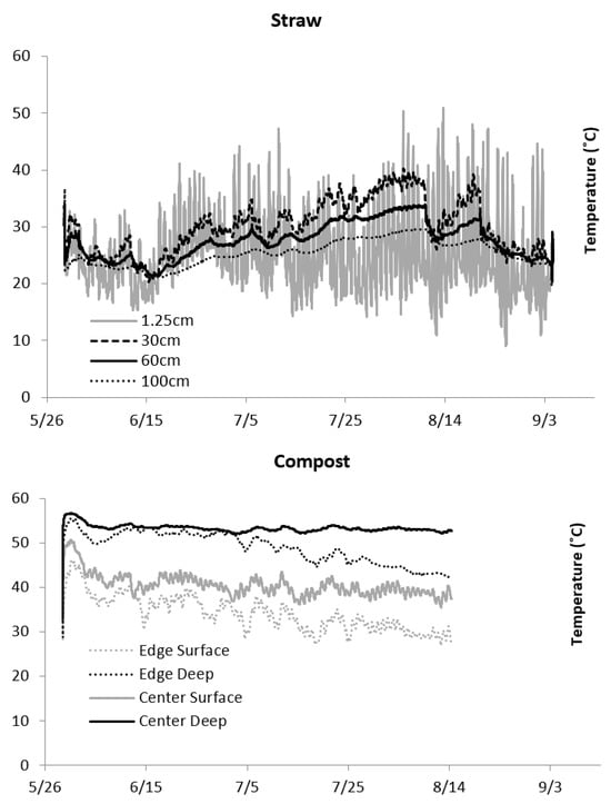In both years, both straw piles produced flies in September when the emergence traps were dismantled. In contrast, the compost piles were relatively dry. Few maggots were found during troweling and emerging stable fly adults were infrequently captured in the emergence traps. In the straw, the pile surface temperature fluctuated with ambient air temperatures, ranging from 15 to 37 °C. At lower depths, the temperatures were more consistent at 20 °C, but steadily increased above 30 °C as summer progressed (Figure 3). Compost temperatures remained high throughout summer, ranging from 29 °C on the surface of the pile’s edge up to 53 °C deeper into the pile’s center (Figure 3). The compost on the surface had more weather exposure, with a greater variance in temperature than the probes buried 30 cm below the surface.