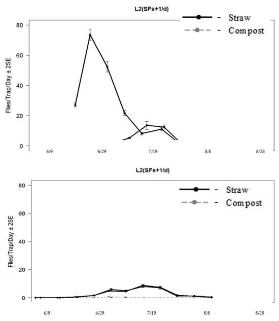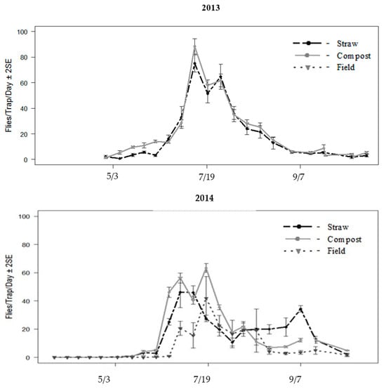Stable flies became abundant at all locations where Olson traps were set. Flies were already active when the traps were set on 22 May 2013, with an average of 13 flies per trap per day (Figure 4). The catch rates were lower in the compost than straw for the first five weeks of the study, and then became equal to the straw result after 25 June. The numbers between the compost and straw were similar, although there were significant differences over time. The catch rates peaked in mid-July, with 500 stable flies per trap before the catches tapered off in August.