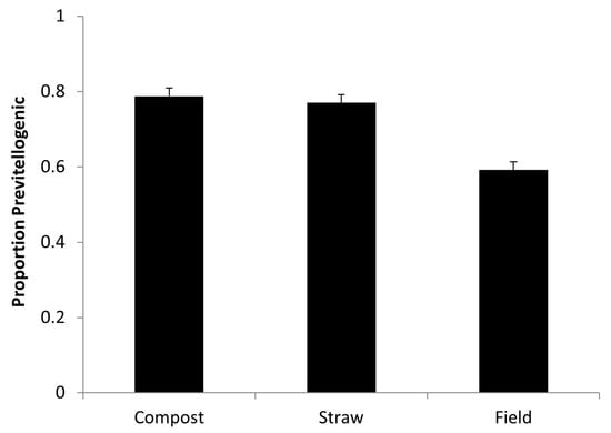 As in 2013, there was no significant interaction between the treatment and time in 2014 (p = 0.24). Consequently, this interaction was removed from the model. The proportion of marker flies captured differed significantly between the straw and compost piles (p < 0.001). Only 52% of the marker flies were captured in the collection containers of the emergence traps set in the straw piles, and 69% were captured in collection containers in compost piles. There was a significant change in the proportion captured over time (p = 0.03). More marker flies were captured at both pile types at the end of the season than the beginning (Figure 7).