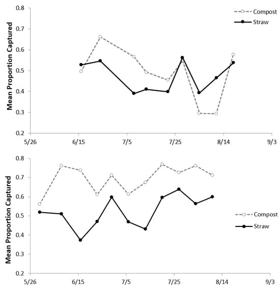Weekly mean proportion of marker flies captured in straw and compost piles in (top) 2013 and (bottom) 2014.