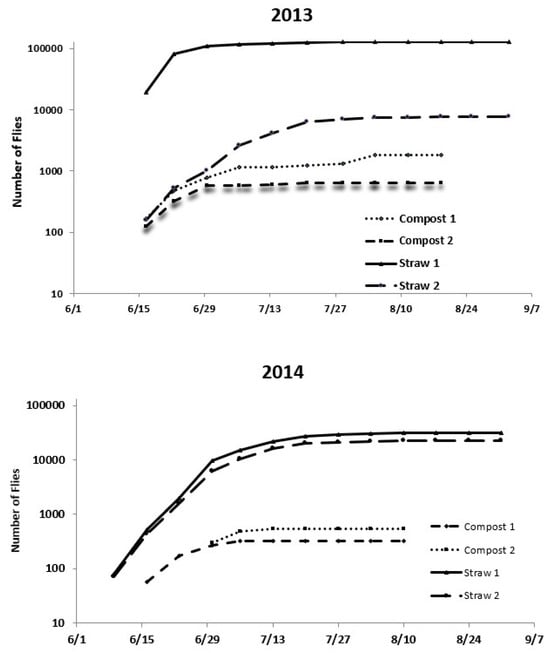 Extrapolated total emergence of stable flies from debris piles vs. end date of weekly trapping intervals in summer 2013 and 2014. Traps in 2013 were not assembled until after flies began emerging. In the top figure, the top solid line is “Straw 1” and the other solid line is “Straw 2”. During 2014, the straw and compost lines overlapped.