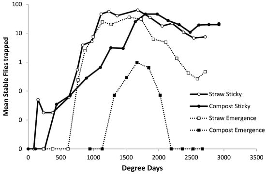 It is possible for developing stable flies to overwinter in piled silage or manure [] as a pile’s internal temperature gradient can protect immatures from freezing []. Furthermore, stable fly development was greater in hay mixed with manure, which was similar to the straw and manure in the current study [] To ensure that previous piles were not an overwintering source for stable flies, all winter bedding packs were hauled away in fall and new packs were laid. As such, any flies emerging from the piles had to have developed from eggs laid that spring by ambient females. Significantly higher numbers of flies emerging from straw than compost piles were observed, yet the ambient adult density value was similar between types of piles. These results indicate that all piles are equally attractive to adult flies. In 2014, flies captured in Olson traps at the beginning and end of the season were flies from elsewhere that were drawn to the piles. The first stable flies in 2014 occurred on Olson traps approximately one month before any flies were captured in the emergence traps on debris piles, which was consistent with the stable fly development time. However, the number of degree days that passed after the flies were first captured in Olson traps was approximately two-times longer than the generation definition of 327.1 degree days. These results imply that, if the first flies on site oviposit on debris piles, maggots take longer than expected to develop. However, females were either not ovipositing in compost piles or maggots did not survive to reach adulthood. As summer progressed, the catch rates in Olson traps remained higher as emergence trap rates decreased. The differences in the seasonal patterns of the catch rates between sticky and emergence traps imply that stable flies have other breeding sites. Decreasing emergence rates from straw toward the end of summer indicated that straw piles became less suitable for developing maggots as summer progressed.