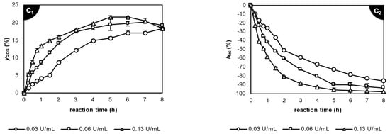 Figure 1 illustrates the GOS yields (yGOS) attained through the utilization of the lactase from K. lactis in the SW over time. In most cases, especially when high enzyme loads were applied in whey with a low initial lactose content, the yGOS exhibited an initial increase in the onset of transgalactosylation, which was followed by reaching a peak and, subsequently, a decline. This pattern indicates the disintegration of the generated GOSs, which can be elucidated by the previously described catalytic mechanism. The GOS synthesis rate is time-dependent, and GOSs act as both a product and a substrate during the two reaction stages. In the early stages of the reaction, GOSs are produced more rapidly than they are hydrolyzed, primarily owing to the fact that lactose is plentiful in the reaction mixture and is highly available for GOS synthesis. With lactose consumption, the GOS production rate decreases, while the hydrolysis rate increases. When the maximum GOS yield is achieved, these two rates become equal. As lactose is depleted, the enzyme is more likely to hydrolyze a GOS instead of lactose. Consequently, the GOS concentration diminishes [,,]. When low enzyme loads were applied in highly concentrated whey, e.g., when an enzyme load of 0.13 U/mL of the K. lactis lactase was applied in concentrated SW with clac(0) equal to 10 or 15% w/v (Figure 1(B1,C1)), the aforementioned peak was not observed during the eight-hour enzymatic reaction owing to the low reaction rate that leads to maximization of the yGOS at longer reaction times.