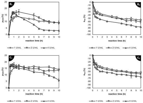 Yields of 1 galactooligosaccharides (yGOS) and 2 lactose hydrolysis (hlac) over catalysis time with lactase from Aspergillus oryzae in sweet whey with initial lactose contents of (A1,A2) 5.1% w/v, (B1,B2) 10% w/v, and (C1,C2) 15% w/v, which were calculated via the analysis of the reactions’ samples using the high-performance liquid chromatography with refractive index detector method.