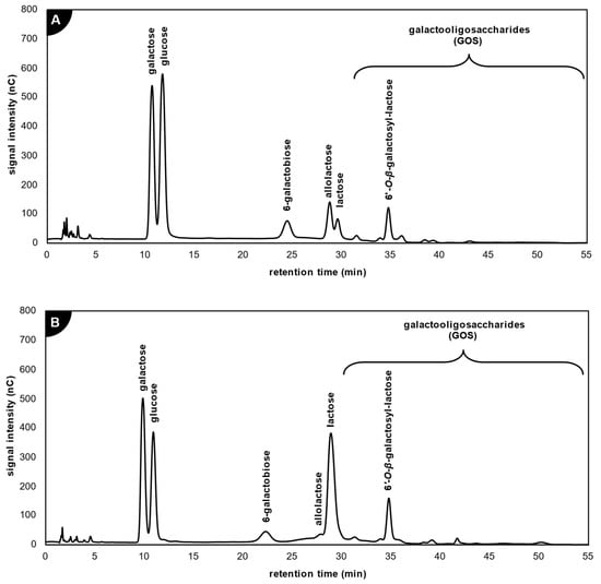 The application of a lactase of different origin in SW and AW has an effect not only on the evolution of the enzymatic reaction and the maximum yGOS achieved but also on the profile of the produced oligosaccharides. For the visualization of the different GOS profiles achieved by applying a different enzyme in a different substrate, Figure 3 displays two characteristic chromatograms for the results of the enzymatic reactions conducted using the two different β-galactosidases on SW and AW that were obtained using the HPAEC-PAD analysis.