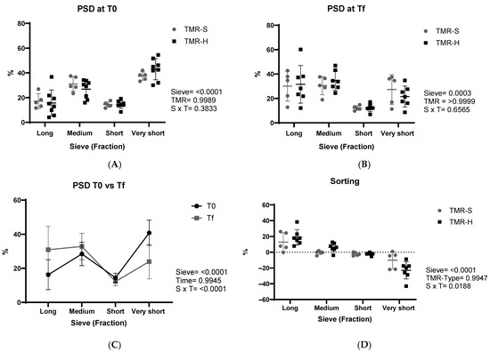 The PSD was elaborated with a linear mixed-effects model for repeated measures. The model included the effects of the type of TMR (TMR-Ty: with silage, TMR-S; with hay, TMR-H) and the Time (before the feeding, T0; 24 h after feeding, Tf) as fixed effects and the interaction between TMR-Ty and Time (TMR-Ty × Time). In another case, the model included the effect of the Sieve fractions (upper sieve > 19 mm, %; medium sieve 8–19 mm, %; lower sieve 4–8 mm, %; bottom pan < 4 mm, %), the Time (before the feeding, T0; 24 h after feeding, Tf), and the interaction between Sieve and Time as fixed effects. When not significant, the effect of the interaction was removed from the model. Šídák’s multiple comparisons test was used to evaluate the differences between the averages.