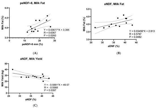 Simple correlations were determined for concentrations of aNDFom (%), peNDF > 8 mm (%), peNDF > 4 mm (%), and milk parameters: yield (kg), fat (%), protein (%), casein (%), lactose (%), urea (mg/dL), BHB (mM), and acetone (mM).
