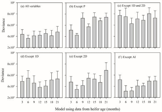 Mean deviance of the milk yield (L) models in the first lactation of grazing heifers using variables corresponding to different ages of the heifer (3, 6, 9, 12, 15, 18, and 21 months of age). The scenarios were as follows: (a) all the variables, (b) all the variables except P, (c) all the variables except 1D and 2D, (d) all the variables except 1D, (e) all the variables except 2D, and (f) all the variables but AI. The error bars represent the standard error of the mean. A lower deviance value indicates a better training fit.