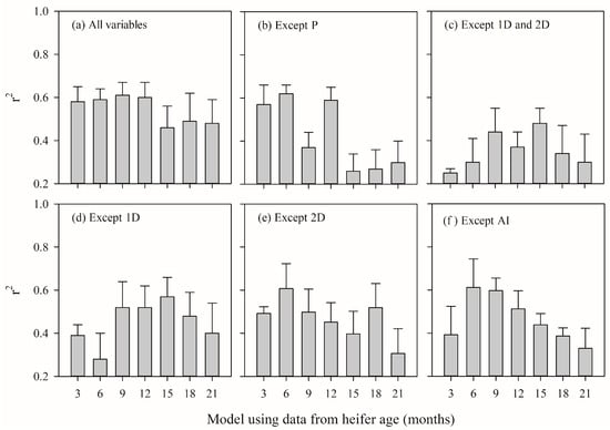 The r2 values were the lowest when 1D and 2D were unavailable for model building (Figure 2c). The r2 was consistently close to or slightly higher than 0.6 from three to twelve months of age when all the variables were included. At six months of age, the r2 value exceeded 0.6 only in the scenarios where P was not included (Figure 2b), 2D was not included (Figure 2e) or AI was not included (Figure 2f). Modeling without AI would be viable at early stages of heifer rearing since the r2 values were high when using data from 6 and 9 months of age.