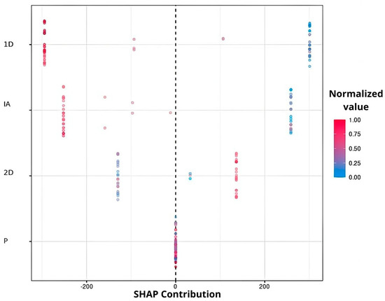 Generally, the DL algorithm (70%) and XGBoost (16%) were the most commonly used in all the scenarios. The ensembles only produced a superior model in 4.7% of runs. Neural networks are well known for classification problems, while the XGBoost can be used directly for regression. Although machine-learning algorithms primarily focus on classification or regression problems, there is an overlap in their utility for solving these two types of problems [27]. The AutoML implementation does not provide SHAP values for DL models, but they are available for XGBoost and could offer insight into how the variables were important. The summary plot of the SHAP values (Figure 3) shows that 1D and AI in the XGBoost model using all the variables at six months of age were the most influential variables. High values for these variables had a negative impact on L; low values would contribute positively to L in the range of 200 to 300 kg. Although P had an average importance of 0.16 (Table 1), in this XGBoost model it was the least important.