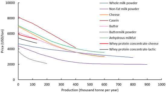 The demand curves for the price-quantity relationships for the dairy commodities were determined using the historic data in the archive of Global Dairy Trade []. The curves are downwards sloping convex, in line with typical commodity demand curves. Since 2000 and 2018, the New Zealand dairy industry has seen a major increase in the production of infant formula. Five or six companies now have facilities wholly or partly dedicated to the production of infant formula and this earned NZD 1,200,000,000 in 2018 []. Since infant formula is produced almost entirely in cans and branded for retail sale, this production was treated as a fixed quantity (92,000 ton/year) and a fixed price (USD 8900/ton) i.e., it did not have a sloping demand curve as it was not a freely tradable international commodity. Processing costs for converting the milk into the various commodities were updated using price indices published by StatsNZ [].