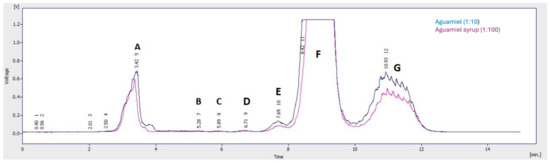 HPLC analysis identified sucrose as the predominant carbohydrate in both aguamiel and syrup. According to the chromatogram, peaks corresponding to oligosaccharides (A–D) were observed until minute 6.71. Subsequently, peaks corresponding to trisaccharides (E), disaccharides (F), and monosaccharides (G) were observed. Of these compounds, both in aguamiel syrup and aguamiel, sucrose was the disaccharide with the highest concentration (Figure 1), with a peak observed at 8.42 min.