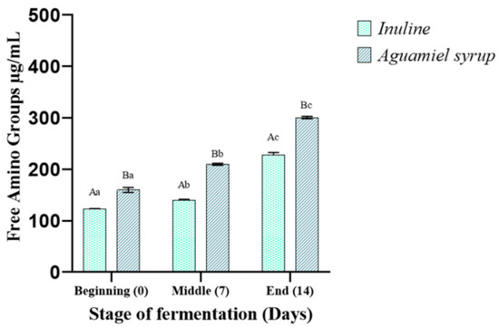 The initial free amino acids in the aguamiel syrup influenced different concentrations observed in both systems, which was higher in the base supplemented with aguamiel syrup (159.63 ± 4.8) compared to the base supplemented with inulin (122.65 ± 0.9) at the initial time. The L. rhamnosus aminopeptidases are regulated by a system of operons, which are activated by various amino acids and act as system promoters [31]. Likewise, a constant release and increased amount of amino groups at the end of fermentation in milk enriched with aguamiel has been reported [9].