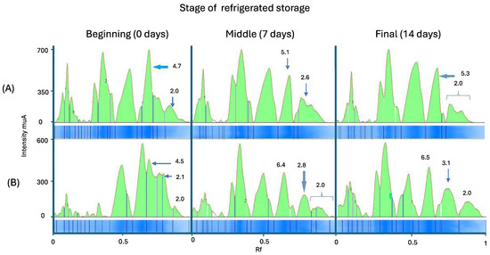 Electropherograms of the peptide separation by SDS-PAGE in the ice cream bases with added L. rhamnosus GG during 14 days of refrigerated storage enriched with (A) inulin and (B) aguamiel syrup.