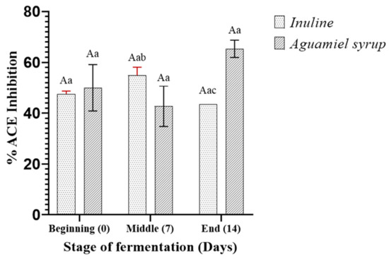 Inhibition of ACE activity by peptide fractions derived from protein fractionation during refrigerated storage of ice cream base with L. rhamnosus GG and enriched with inulin and aguamiel syrup. Lowercase letters (a–c) indicate the comparisons of means between different refrigerated storage times within the same systems. Uppercase letters (A, B) indicate the comparisons of means between different systems at the same refrigerated storage time.
