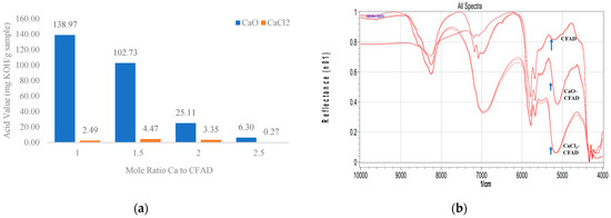 Figure 1a illustrates the acid value (mg KOH/g sample) of Ca-soap CFAD products produced with different Ca sources and mole ratios of Ca to CFAD. Increasing the mole ratio of Ca to CFAD could reduce the acid value of Ca-soap CFAD when CaO or CaCl2 was used as a calcium source. However, CaCl2-CFAD exhibited a lower acid value than CaO-CFAD, indicating higher conversion of fatty acids into protected fat. The 2.5-mole ratio of Ca to CFAD resulted in the lowest acid value, suggesting it was the most effective method for protecting CFAD. The reflectance of chemical bonds from FT-NIRS compared Ca-soap CFAD with different calcium sources and the lowest acid value (2.5-mole ratio of Ca to CFAD). Figure 1b shows the CFAD, CaO-CFAD, and CaCl2-CFAD spectra, while Table 3 presents the reflectance values of the carboxylic group (C=O str. second overtone of COOH) or carboxylic groups in fatty acids. As shown in Figure 1b and Table 3, CaCl2-CFAD exhibited the lowest carboxylic group reflectance, indicating the highest conversion of fatty acids to protected fat among the tested conditions.
