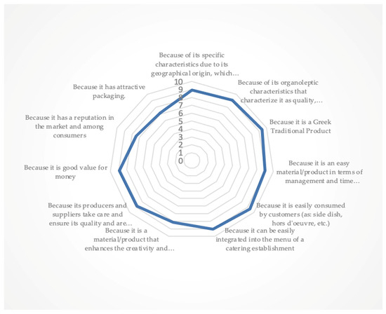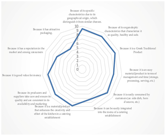 Moderately important but with an average ranking from 8.99 to 8.00 mean values, they considered this time Q1, “Because of its specific characteristics due to its geographical origin which distinguish it from similar cheeses” (8.94), Q9, “Because it is good value for money” (8.88), Q8, “Because its producers and suppliers take care and ensure its quality and consistent in its availability and marketing” (8.83), and Q7, “Because it is a material/product that enhances the creativity and effect of the kitchen in a catering establishment” (8.16).