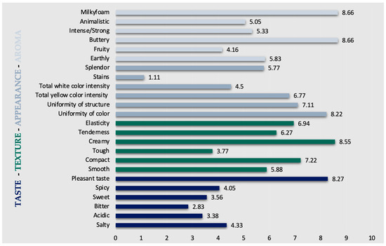 According to the results of the texture experts’ characterization of the cheese, the most important were the following: creamy texture (8.55) followed by compact texture (7.22), elasticity (6.94), tenderness (6.27), softness (5.88), and least important was hardness (3.77).