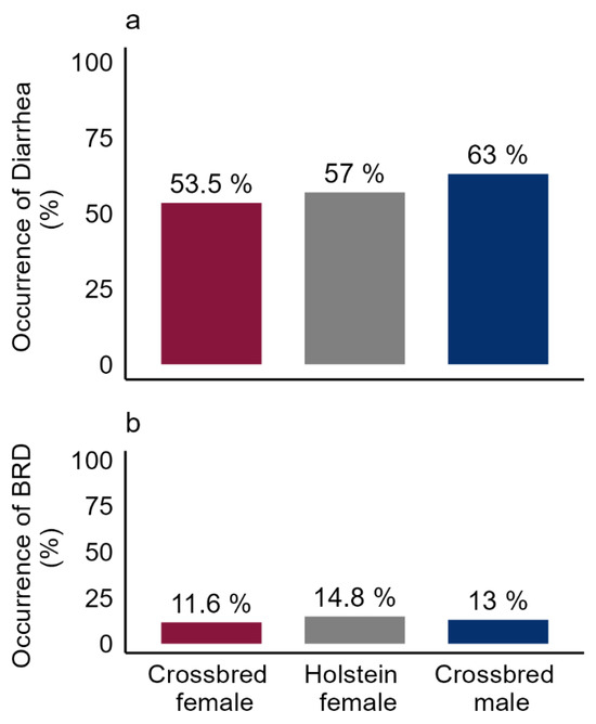 The occurrence of BRD in our study ranged from 11% to 14%, which is lower than the values reported by Fernandes et al. [63], who observed 26% of beef-on-dairy calves with lung consolidation at 61 days of age, and by Pereira et al. [21], who reported an incidence of approximately 55% in crossbred calves. Additionally, a study conducted on veal farms in the Netherlands showed that at least 38% of calves were clinically affected by BRD [64]. The occurrence of diarrhea was comparable to that reported by Pereira et al., who observed over 60% of affected calves, and by Pharo et al. [65], who reported that 63.8% of crossbred calves were treated for diarrhea. In terms of performance, the ADG in our study exceeded 1000 g/day, whereas Pereira et al. [21] reported gains below 600 g/day. These discrepancies may reflect differences in the management practices employed or differences in how the data were collected in each study.