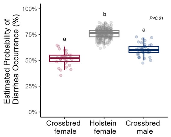 The descriptive data on the occurrence of diarrhea among the groups are presented in Figure 1a. Holstein calves showed a higher probability of occurrence of diarrhea compared to both male and female crossbred calves (p < 0.01, Figure 2). The probability of diarrhea occurrence showed that Holstein calves had 2.95 times higher odds of being diagnosed and treated for diarrhea compared to Ang × Hol crossbred calves (95% CI: 1.63–5.35; p < 0.01). Ang × Hol crossbred female calves showed a 69% reduction in the odds of developing diarrhea compared to Holstein calves (OR: 0.31; 95% CI: 0.15–0.67; p < 0.01; Table 2). While Ang × Hol crossbred male calves showed a 62% reduction in the odds of developing diarrhea compared to Holstein calves (OR: 0.38; 95% CI: 0.17–0.83; p = 0.01; Table 2). Ang × Hol crossbred female calves had similar odds of developing diarrhea compared to Ang × Hol crossbred male calves (p = 0.76). However, STP (p = 0.14) were not associated with the occurrence of diarrhea.