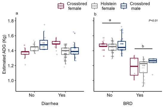 Impact of (a) diarrhea on ADG according to groups of calves. (b) BRD on ADG according to groups of calves. Different letters indicate statistical differences based on pairwise comparisons using the Tukey test. Error bars represent 95% CI.