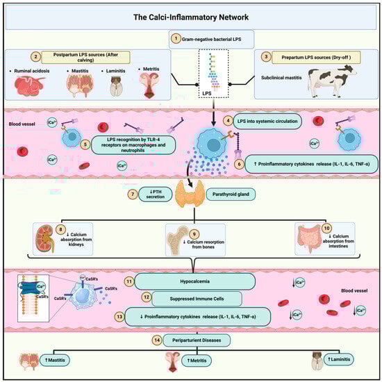 The Calci-Inflammatory Network, however, can become dysregulated under conditions of chronic or repeated exposure to LPS. In scenarios such as persistent subacute ruminal acidosis (SARA), mastitis, metritis, or untreated hoof infections, the immune system may remain in a prolonged state of activation. This sustained inflammatory state leads to continuous cytokine production, which in turn interferes with calcium homeostasis by antagonizing PTH actions or by altering vitamin D metabolism. As a result, the restoration of normal calcium levels is delayed, perpetuating a cycle where chronic hypocalcemia further undermines neuromuscular function and metabolic stability, while persistent inflammation continues to disrupt calcium mobilization [43].