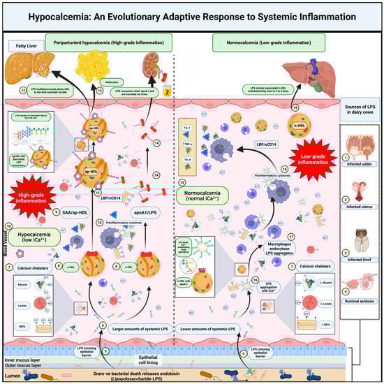 Hypocalcemia as an AdapiCa2+ modulates the clearance and inflammatory potential of lipopolysaccharide (LPS) originating from mucosal tissues such as the mammary gland, gastrointestinal tract, reproductive tract, and infected hooves (1, 2, 3, 4). LPS traverses the epithelial barrier into the bloodstream (5), where it binds to chelators (e.g., albumin, lactate, and NEFA), which reduce free iCa2+ (7). Under transient or moderate hypocalcemia (10), lower iCa2+ dampens certain calcium-dependent immune pathways, steering LPS toward lipoprotein-mediated clearance via acute-phase high-density lipoproteins containing serum amyloid A (SAA-ap-HDL) (9). Lipopolysaccharidetive Response to Systemic Inflammation. This schematic illustrates how shifts in ionized calcium (-binding protein (LBP) and CD14 (11) facilitate LPS binding to ap-HDL, directing it for detoxification in hepatocytes (possibly contributing to fatty liver) (12) or temporary storage in adipocytes (13). Apolipoprotein A1, dissociated from n-HDL, also binds LPS for renal excretion (14). During mild hypocalcemia, macrophage activation (15) remains subdued, leading to limited release of pro-inflammatory cytokines (IL-1, IL-6, TNF-α). In contrast, normocalcemia (16) supports lamellar LPS aggregation in the presence of iCa2+, enabling macrophages to take up these larger, structurally inert complexes (17). Although macrophages then release cytokines (IL-1, IL-6, TNF-α) (18), the inflammatory response may remain more localized than systemic. Some fraction of LPS is also bound by normal HDL (n-HDL) and cleared by the liver (19). Overall, this figure emphasizes that mild hypocalcemia can serve as an adaptive brake on systemic inflammation by reducing excessive immune-cell activation and directing LPS toward lipoprotein-based clearance, whereas adequate iCa2+ levels favor lamellar LPS aggregation and macrophage uptake. Taken together, these complementary pathways underscore the dynamic role of calcium homeostasis and lipoprotein interactions in balancing LPS clearance under varying inflammatory states. For detailed information on the concentration of LPS (endotoxin) in blood circulation, please refer to Supplementary Table S2. [Figure created using 2025 BioRender in collaboration with Zohaib Saleem (2025) https://BioRender.com/shc8ckv].