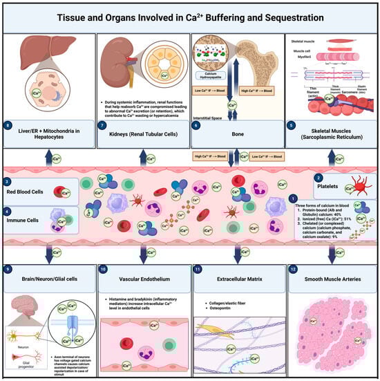 Tissues and Organs Involved in iCa2+ Buffering and Sequestration During Inflammation. Calcium in the bloodstream exists in three primary forms: protein-bound (~40%), ionized (iCa2+, ~50%), and chelated (~10%). This delicate balance supports essential physiological processes and adapts to systemic inflammation (1). Platelets sequester and release iCa2+ during inflammatory processes to regulate coagulation and immune responses (2). Red blood cells buffer iCa2+ to maintain membrane flexibility and oxygen transport, both of which can be compromised under inflammatory conditions (3). Immune cells depend on iCa2+ buffering for activation, migration, and cytokine release—functions that intensify during inflammation (4). Skeletal muscle cells store and release iCa2+ via the sarcoplasmic reticulum, enabling contractions that may be heightened in inflammatory states (5). Bones act as the largest calcium reservoir, releasing iCa2+ into the bloodstream during inflammation-induced hypocalcemia or storing it in periods of hypercalcemia (6). The kidneys regulate iCa2+ homeostasis through reabsorption or excretion; however, systemic inflammation can impair renal function, leading to abnormal calcium wasting or retention (7). Hepatocytes buffer iCa2+ within the endoplasmic reticulum and mitochondria, playing a critical role in detoxification and metabolic responses to inflammation (8). Neurons rely on iCa2+ buffering for synaptic signaling, while glial cells modulate intra- and extracellular calcium levels during neuroinflammatory states (9). Vascular endothelial cells buffer iCa2+ in response to inflammatory mediators such as histamine and bradykinin, thereby affecting vascular permeability and tone (10). In the extracellular matrix, iCa2+ binds to collagen, elastic fibers, and osteopontin, buffering excess calcium while maintaining tissue integrity under inflammatory stress (11). Finally, smooth muscle cells regulate contraction and relaxation by buffering and releasing iCa2+—processes crucial for preserving vascular integrity and blood flow during inflammation (12) [Figure created using 2025 BioRender in collaboration with Zohaib Saleem; (2025) https://BioRender.com/shc8ckv].