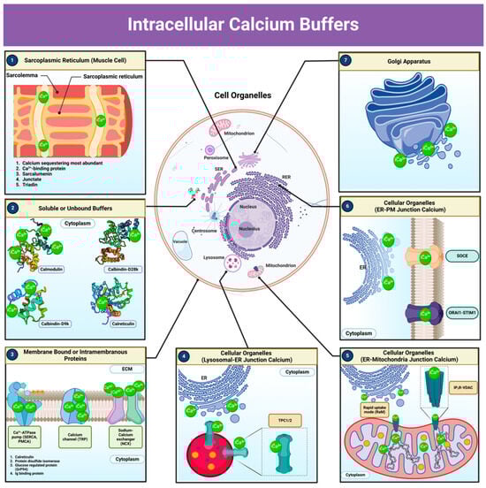 Intracellular Calcium Buffers. Pathways and components involved in intracellular calcium (Ca2+) buffering across various organelles and cellular structures are shown: (1) In muscle cells, the sarcoplasmic reticulum functions as a primary site for Ca2+ sequestration and release, mediated by calcium-binding proteins such as calsequestrin, sarcalumenin, junctate, and triadin; (2) In the cytoplasm, soluble calcium-binding proteins—including calmodulin, calbindin-D28K, calbindin-D9K, and calreticulin—transiently bind free Ca2+, thereby regulating intracellular levels and signaling; (3) Membrane-associated proteins, such as the sarco/endoplasmic reticulum Ca2+-ATPase (SERCA), transient receptor potential (TRP) calcium channels, and the sodium-calcium exchanger (NCX), transport calcium across cellular membranes to maintain overall calcium homeostasis; (4) Calcium exchange between lysosomes and the endoplasmic reticulum occurs via two-pore calcium channels (TPC1/2), supporting both calcium storage and signaling; (5) At the endoplasmic reticulum (ER)-mitochondria junction, calcium transfer is mediated by inositol trisphosphate receptor (IP3R)-VDAC (voltage-dependent anion channel) complexes, with mitochondria buffering calcium through the rapid uptake mode (RaM) to support metabolic functions; (6) At the ER-plasma membrane junction, store-operated calcium entry (SOCE) is controlled by ORAI-STIM1 (Orai-stromal interaction molecule 1) interactions, which replenish ER calcium stores; (7) The Golgi apparatus also serves as a calcium reservoir, contributing to vesicular trafficking and protein modification. Collectively, these systems underscore the intricate and interconnected mechanisms by which calcium is buffered, stored, and mobilized within cells to support vital cellular processes and signaling pathways [Figure created using 2025 BioRender in collaboration with Zohaib Saleem; (2025) https://BioRender.com/shc8ckv].