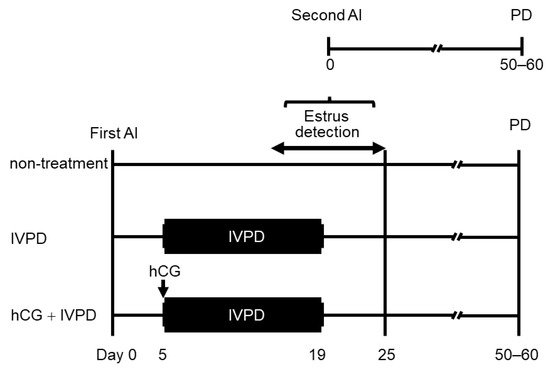 Schematic diagram of the experimental model. The day of artificial insemination (first AI) was defined as Day 0. The untreated group was defined as “non-treatment”. An intravaginal progesterone (P4) device (IVPD) was inserted from Day 5 to 19 for the “IVPD” group. hCG (3000 IU) and IVPD treatments were conducted simultaneously for the “hCG + IVPD” group. Estrus detection was performed from 14 to 25 days after AI. AI was performed when estrus was detected up to Day 25 (second AI). Pregnancy was determined by rectal palpation between 50 and 60 days after AI. PD, pregnancy diagnosis.