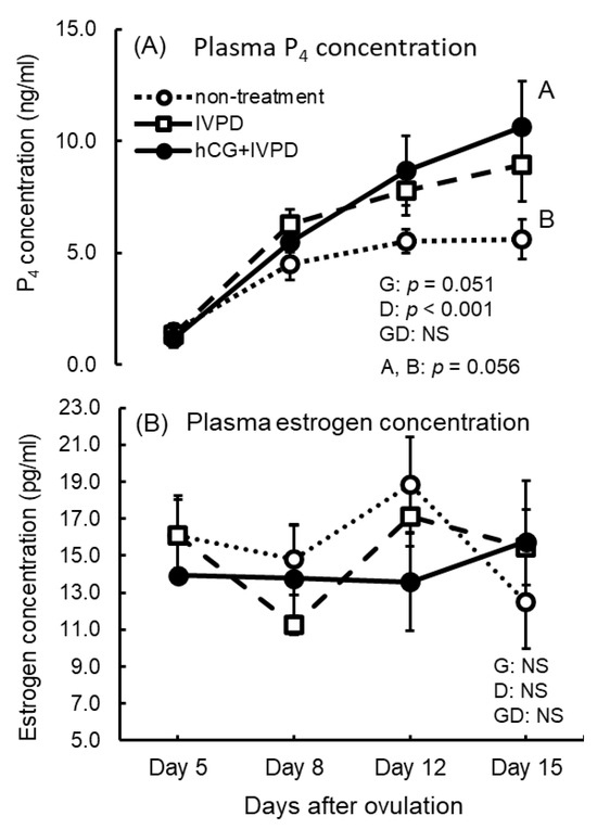 The results are shown in Figure 2. For plasma P4 concentration, the day effect was significant (p < 0.001) and the treatment effect showed a tendency (p = 0.051), and there were no differences in the treatment-by-day interaction. The plasma P4 concentration in the hCG + IVPD group tended to be higher than that in the non-treatment group on Day 15. No differences were observed for day effect, treatment effect, and the treatment-by-day interaction in plasma E concentrations.