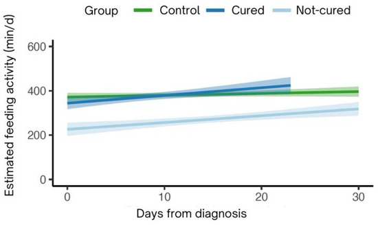 There was a significant interaction (p < 0.01; Figure 1) between the groups over time for feeding activity. Non-cured cows showed a significant increase of 2.7 ± 0.9 min in feeding activity over the days compared to control (p < 0.01), whereas there was no significant difference in feeding activity over the days for cured cows (1.61 ± 1.26 min; p = 0.20) and control cows. Additionally, it can be observed that non-cured cows had lower average feeding activity over the period compared to the control (non-cured: 284 min/day; control: 395 min/day). Cured cows had an average feeding activity time as control cows (cured: 324 min/day; control: 395 min/day).