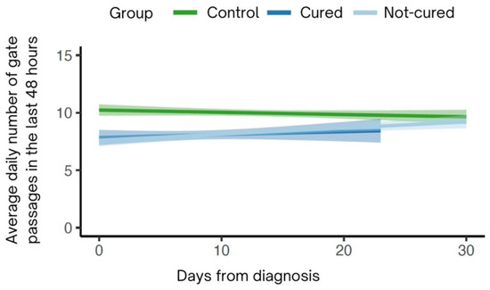 There was a significant interaction between the daily average number of gate passages over the last 48 h and the groups over time (p < 0.01; Figure 2). Non-cured cows showed an increase of 0.08 ± 0.03 passages over the days compared to the control (p < 0.01). Cured cows also showed a significant difference in gate passages over the days (0.09 ± 0.04; p = 0.05). Both cured and non-cured cows passed through the gate 9.0 times, while control cows passed through the gate 10.0 times.